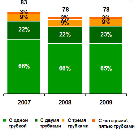 Необходимо отметить, что в 2009 году наметилось увеличение интереса покупателей к телефонам с несколькими трубками в комплекте. В 2007 и 2008 их доля оставалась неизменной и составляла 34%, а в исследуемом периоде достигла 35%. Лидерами продаж, как и прежде, остаются модели с одной трубкой в комплекте (65%). На втором месте оказались телефоны с двумя трубками (23%). Третью и четвертую строчки заняли модели с 3 (9%) и 4-5 (3%) трубками соответственно. Доли последних не меняются уже на протяжении трех лет.