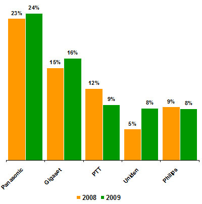 По данным агентства MZA, абсолютным лидером продаж DECT телефонов в мире в 2009 году стала Panasonic. Необходимо отметить, что компания остается на вершине рейтинга уже в течение нескольких лет. Доля рынка Panasonic с каждым годом продолжает расти: в 2008 – 23%, и в 2009 поднялась до 24%. Компания обгоняет своего ближайшего конкурента Siemens Gigaset на 8 процентов.